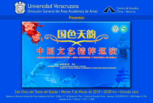 La magia del sonido y el movimiento chinos se harán presentes en la sala “Dagoberto Guillaumin” del Teatro del Estado el próximo 9 de marzo, al recibir el espectáculo Belleza Nacional. Bellos sonidos del cielo, montado exclusivamente para los Institutos Confucio de los países hispánicos pero que en esta ocasión, gracias al Centro de Estudios China-Veracruz (Cechiver) y la Dirección General de Artes de la Universidad Veracruzana (UV), actuará para el público de esta ciudad que tendrá la oportunidad de apreciar un poco de la singular cultura china.