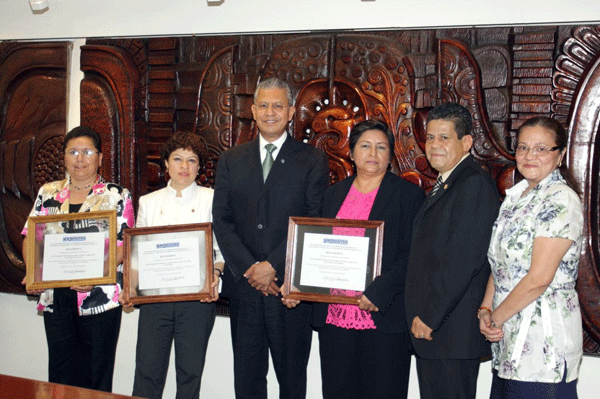 Directoras de las facultades reacreditadas, acompañadas por el rector Raúl Arias, el representante