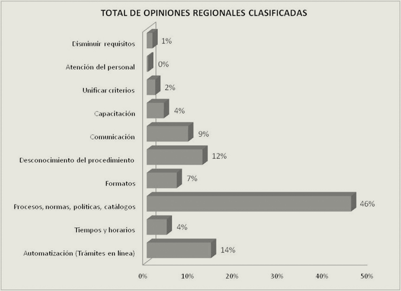 En menor medida, pero no menos importante, se registraron opiniones referidas a unificar criterios de revisión de trámites y a disminuir requisitos basados en la confianza y no en la sospecha de malos manejos de recursos.