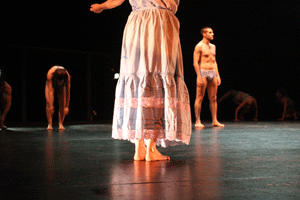 Mireya López, Juan Meza, Janice Platt, Abraham Ponce, Daniel Reséndiz, Guadalupe Ruiz, Martha Rosiles y Sara Tolosa se agrupan al centro del escenario, ahí Barrón revisa un movimiento en el que toda la compañía queda aglutinada como un solo cuerpo, lo repiten hasta estar de acuerdo en las acciones y tiempos del mismo, en cómo serán iluminados y cómo se escuchará el sonido en el momento. Terminan y se dirigen a prepararse para el momento de abrir el telón. |