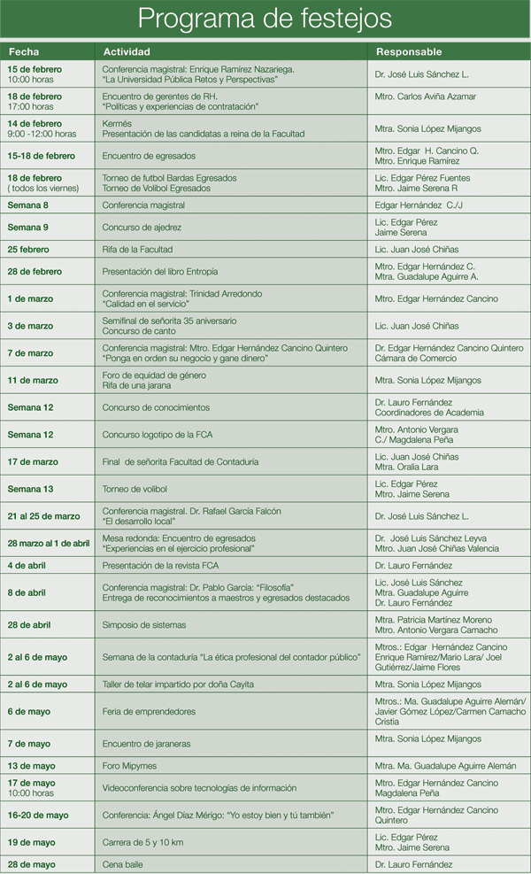 Lauro Fernández Vidal, director de la Facultad, señala que durante el semestre febrero-julio 2011 se realizarán los festejos del 35 aniversario y que incluyen actividades académicas como maratones y coloquios; actividades deportivas, culturales y artísticas; una cena de gala a efectuarse el 28 de mayo, donde se premiará a los mejores promedios.