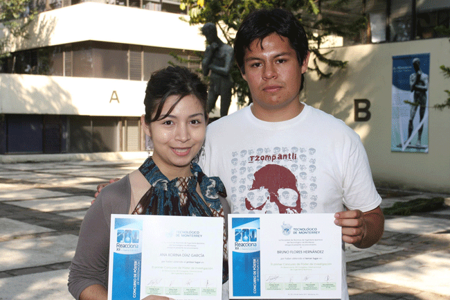 Ana Korina Díaz García y Bruno Renato Flores Hernández, estudiantes de la Facultad de Ingeniería Química de la Universidad Veracruzana (UV), ganaron el primero y tercer lugar, respectivamente, en el Primer Concurso de Póster de Investigación, realizado en el marco del XII Congreso Internacional de Ingeniería Química, convocado por el Instituto Tecnológico y de Estudios Superiores de Monterrey (ITESM) campus Monterrey.