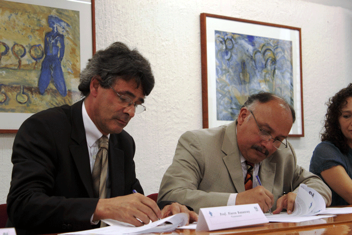 El directivo francés Pierre Bazantay y el secretario académico de la UV, Porfirio Carrillo,