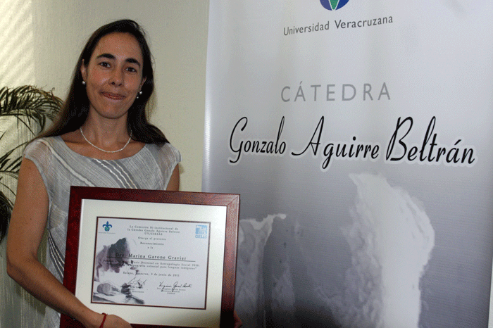 La investigadora Marina Garone Gravier ganó el Premio Anual Cátedra Gonzalo Aguirre Beltrán a la Mejor Tesis Doctoral en Antropología Social, convocado por la Universidad Veracruzana (UV) y el Centro de Investigaciones y Estudios Superiores en Antropología Social (CIESAS), en su edición 2010.