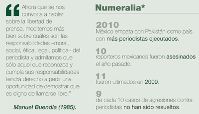 Para García Niño, “en este país la libertad de expresión no debe celebrarse sino ejercerse cotidianamente”. Agregó que en México muchos de los medios de comunicación masiva han crecido al amparo del poder, pues a ambos les conviene la posibilidad de manejar información privilegiada y “esto no quiere decir que la relación sea perversa per se, pero se puede pervertir”. |
