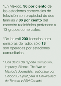 En ese contexto, comentó, la libertad de expresión se vuelve muy relativa, “sin olvidar que definitivamente en la televisión no existe, no hay más que el punto de vista de quienes pertenecen al grupo dominante del país”. En cambio, “en la radio hay alguna que otra voz que puede ser discrepante, como la de Carmen Aristegui o la de Miguel Ángel Granados Chapa”.