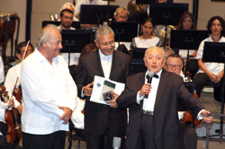 La violonchelista Inna Nassidze y la pianista Guadalupe Parrondo acompañaron a Luis Herrera en este concierto-homenaje. Cuando llegó el intermedio, el maestro abandonó por un momento el escenario para regresar acompañado del rector Raúl Arias Lovillo, quien aplaudió la obra del decano nacional de los directores de orquesta.
