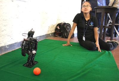 Patricia, Miguel y Marlon participaron con Huitzilobot, un humanoide que es capaz de buscar e identificar una pelota; al encontrarla puede caminar hacia ella, patearla calculando meterla en una portería y ponerse de pie si es que llega a caerse hacia atrás, hacia adelante o de costado.