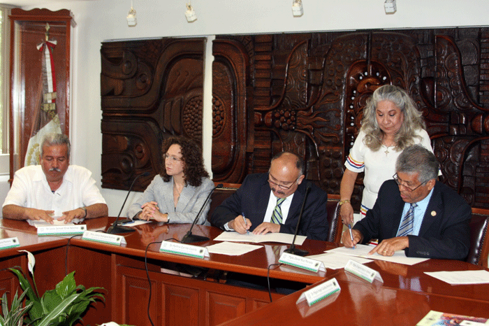 A la firma de convenio realizada en la Sala de Juntas de la Rectoría de la UV acudieron Leticia Rodríguez Audirac, secretaria de la Rectoría; Samuel Cruz, director general de Investigaciones; Miguel Ángel Casillas, director del Área Académica de Humanidades; Alejandro Moreno, director de Vinculación General, y Manlio Fabio Casarín, director de la Facultad de Derecho.