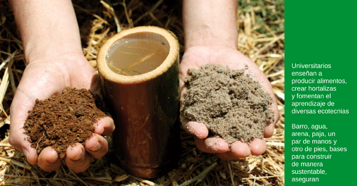 Respecto de la cooperación, dijo que la construcción con tierra hace necesaria la participación de varias personas; por ejemplo, si se tratara de un grupo de 10 o 15, primero se forman equipos de dos o tres para juntar los elementos básicos (agua, barro, paja y arena), colocarlos en una lona y revolverlos o amasarlos con los pies. Después, entre todos, van dando forma a los muros con sus manos.