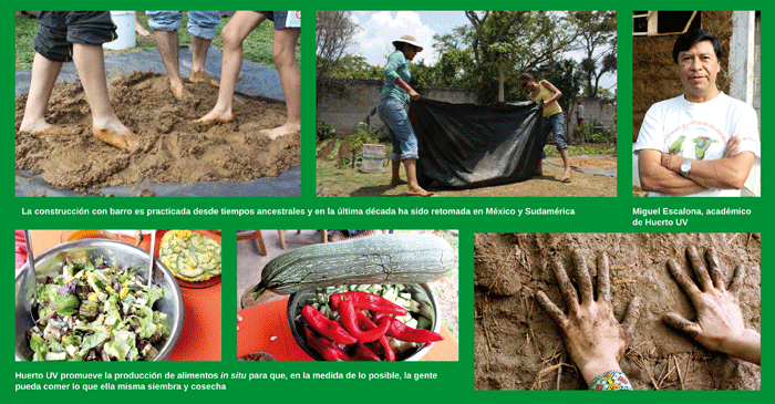 Otro proyecto que es impulsado por Huerto UV es la integración de una red de bioconstrucción. Ellos parten de que con barro, agua, arena, fibras, un par de manos y otro de pies, se puede edificar prácticamente cualquier cosa.
