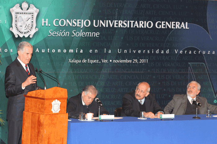 "Celebrar la Autonomía de la UV es exaltar la educación pública del país", enfatizó y agregó que las universidades públicas son testimonio y prenda del progreso y calidad de la nación, de la evolución de la República.