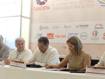 Liliana Betancourt Trevedhan, vicerrectora del campus Veracruz- Boca del Río de la UV, acudió a la sesión de Consejo Directivo en la Convención Nacional de la Cámara Nacional de la Industria de Transformación (Canacintra) 2012 para que el convenio se concretara con la firma del testigo de honor, Sergio Cervantes Rodiles, presidente de la Canacintra.