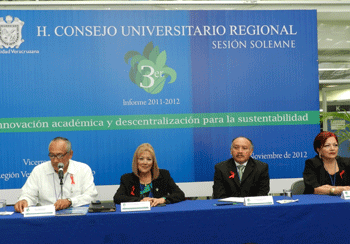 En sesión solemne ante el Consejo Universitario Regional (CUR), figura que se integró en la actual administración universitaria, la Vicerrectora aseveró: “Hoy los programas educativos son de calidad y atienden la demanda de jóvenes con necesidades de formación profesional acorde a un mercado laboral productivo, globalizado y más competitivo”. |