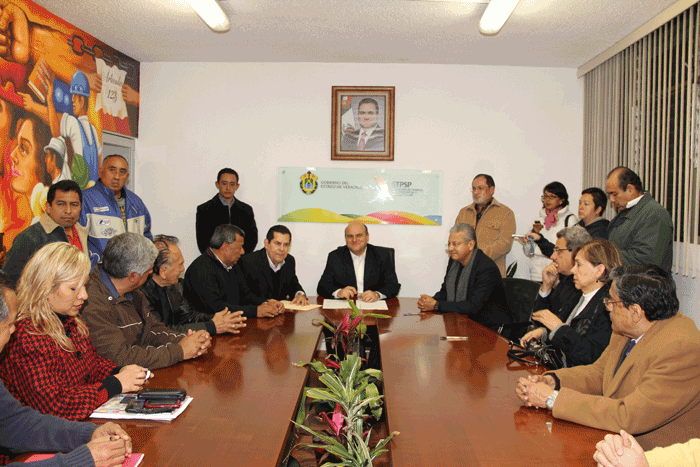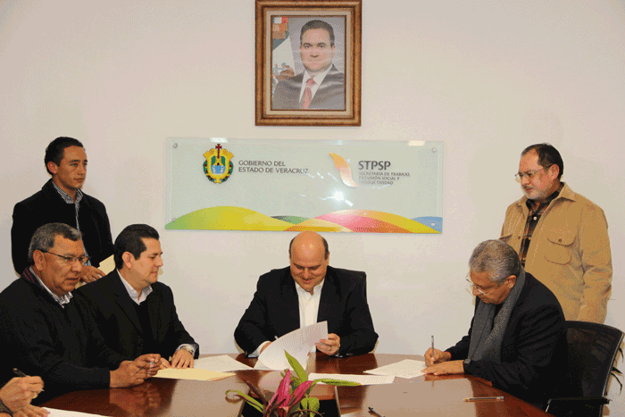 En las instalaciones de la Secretaría del Trabajo, Previsión Social y Productividad (STPSP), el rector de la UV, Raúl Arias Lovillo, y el secretario general del SETSUV, Pedro Reducindo Villalba, firmaron el convenio que puso fin al emplazamiento a huelga en presencia del titular