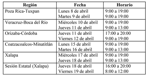 Las actividades iniciarán en el campus Poza Rica-Tuxpan, los días 8 y 9 de abril; posteriormente, el 10 y 11 del mismo mes, será en Veracruz-Boca del Río; el 11 y 12 de abril, en Orizaba-Córdoba; los días 15 y 16 de abril se llevará a cabo en el campus Coatzacoalcos-Minatitlán; en el campus Xalapa será el 17 y 18 de abril, para concluir con la sesión estatal el 18 y 19 de abril.