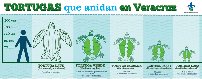 La tortuga laúd es la más grande de todas: llega a medir hasta 2.4 metros de longitud. La segunda en tamaño es la verde –la más abundante en la costa de la entidad–, le siguen la caguama, la carey –reconocida por su caparazón color ámbar– y finalmente la lora –que mide alrededor de