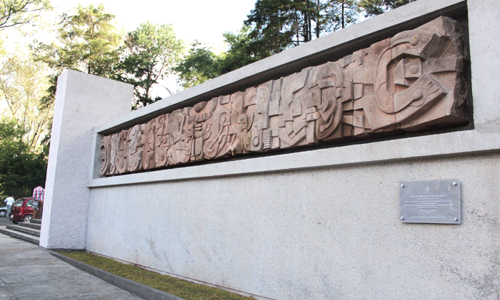 Se trata de un alto relieve en cantera rosa que simboliza “Arte, Ciencia, Luz”