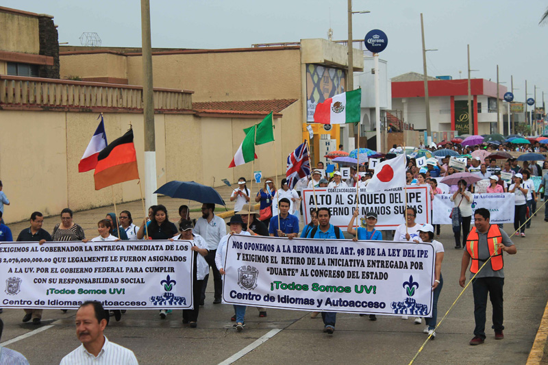 En Coatzacoalcos, integrantes de la Vicerrectoría, Centro de Idiomas; Sistema de Enseñanza Abierta; Centro de Investigación en Recursos Energéticos y Sustentables; Escuela de Enfermería, las facultades de Contaduría y Administración, Ciencias Químicas e Ingeniería; egresados; sindicatos universitarios y la Coalición de Pensionistas Independientes del Estado de Veracruz, marcharon al grito de “Somos UV” y “La UV no se toca”.