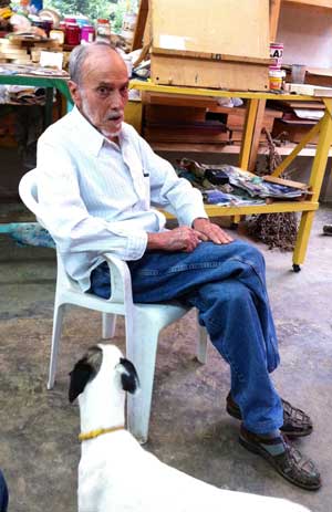 En su taller de Rancho Viejo, con uno de sus perros (Foto: Xavier Cózar) |