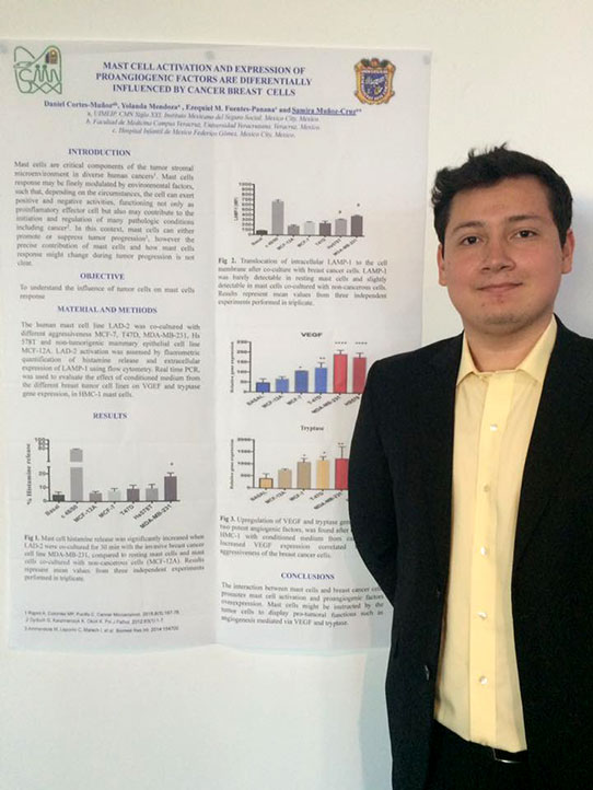 Daniel fue aceptado y recibió una beca de la Asociación Mexicana de Ciencias para realizar una estancia de siete semanas en la Ciudad de México. Participó en la investigación “Comunicación entre mastocitos y células tumorales de cáncer de mama”; al mismo tiempo, recibió clases de epidemiología y capacitación de técnicas de laboratorio.