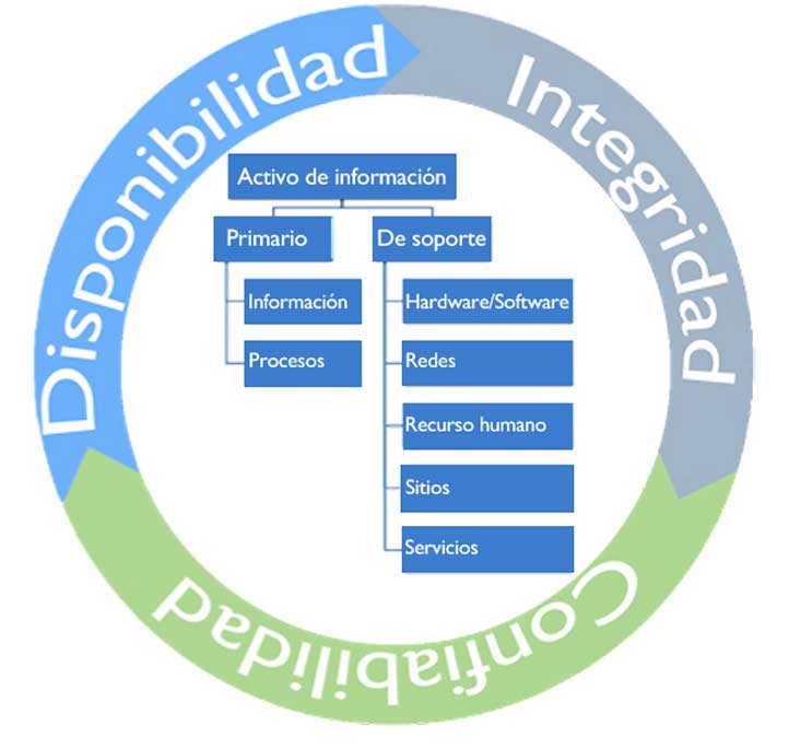 Los activos de información se clasifican en primarios y de soporte. Éstos, se enfrentan continuamente ante amenazas relativas a la seguridad, provenientes de diversos orígenes tales como: vandalismo, fenómenos naturales, ataques cibernéticos en redes y sistemas de información, espionaje, sabotaje, negligencia, así como el desconocimiento o mal uso del tratamiento de la información por parte de las personas.