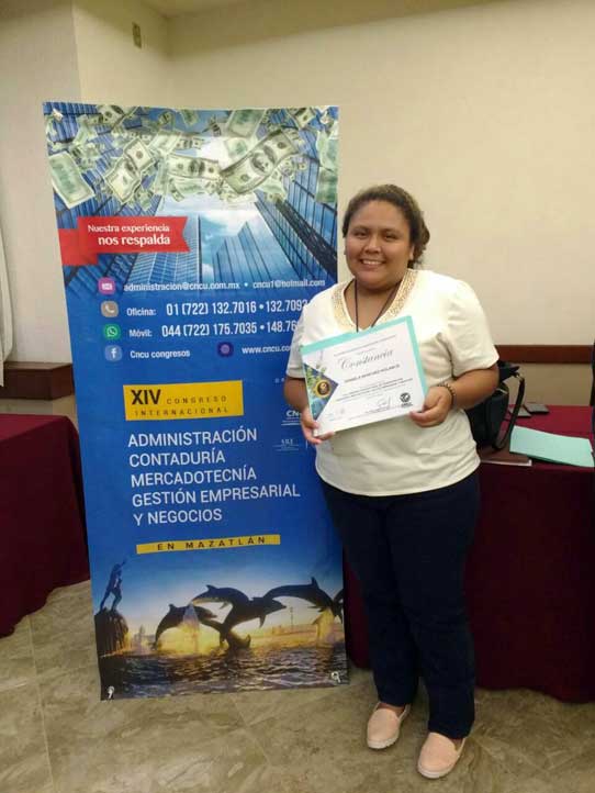 Daniela Sánchez Nolasco, alumna del cuarto semestre de la Licenciatura en Administración, ganó el Sexto Concurso de Cartel “Elijo Ser UV”, cuyo premio fue asistir al XIV Congreso Internacional de Administración, Contaduría, Mercadotecnia, Gestión Empresarial y Negocios, que se desarrolló del 4 al 6 de mayo en Mazatlán, Sinaloa.