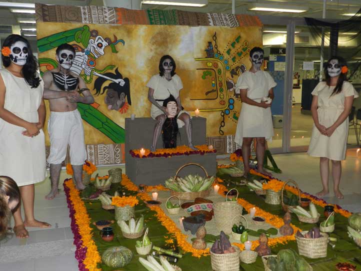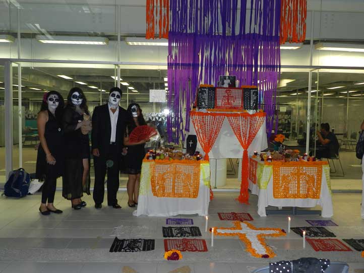 En los pasillos de las facultades y de la Unidad de Servicios Bibliotecarios y de Información (USBI) se observaron estudiantes maquilladas de catrinas y otros más vestidos con trajes típicos, quienes junto con sus compañeros montaron diferentes tipos de altares y en cada uno de ellos, la explicación de sus orígenes y significado.
