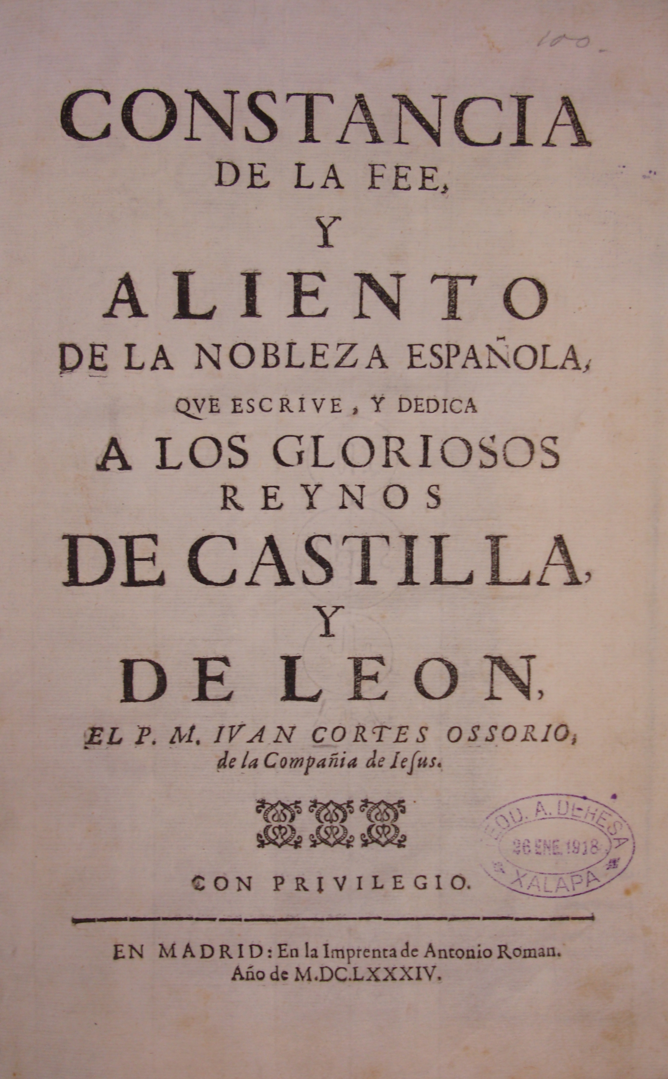 Escrito por el jesuita Juan Cortes Osorio, en el que narra sus vivencias en la corte española durante el siglo XVII. Físicamente el libro presenta detalles tales como grabados, un escudo Heráldico de los reinos de Castila y León. De igual manera, encontramos varios sellos indicando que este libro perteneció al ex gobernador Teodoro A. Dehesa.