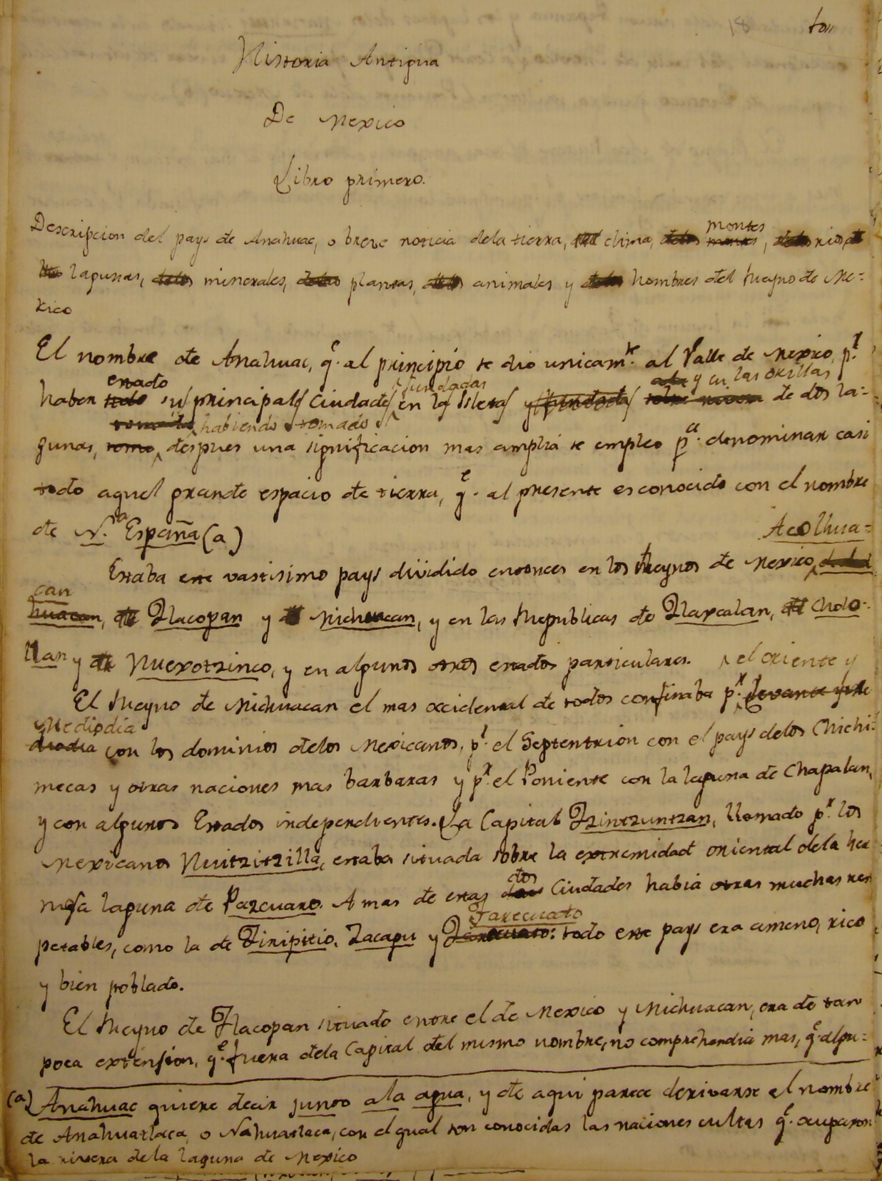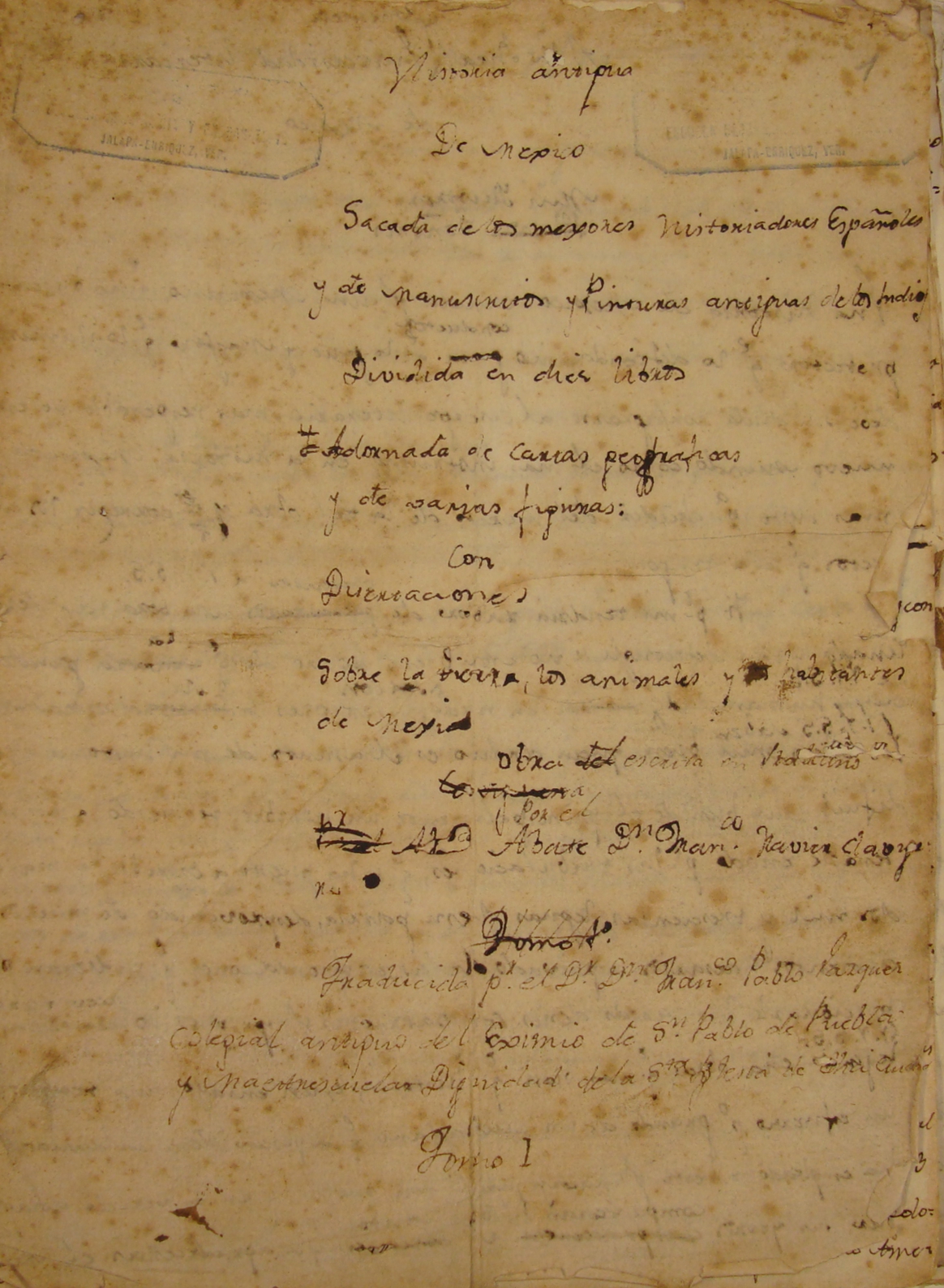 Primera traducción del Italiano al castellano por el Dr. D. Francisco Pablo Vázquez, Colegial Antiguo del Eximio de San Pablo de Puebla y Maestrescuelas, Dignidad de la Santa Iglesia de dicha ciudad. Obra monumental escrita durante el exilio del autor en Italia, que compone la historia de los mexicanos y dedicada a la Universidad Pontificia de la Nueva España, en donde realizó sus estudios. Este manuscrito se imprimió posteriormente en México por Juan R. Navarro, en 1853.
