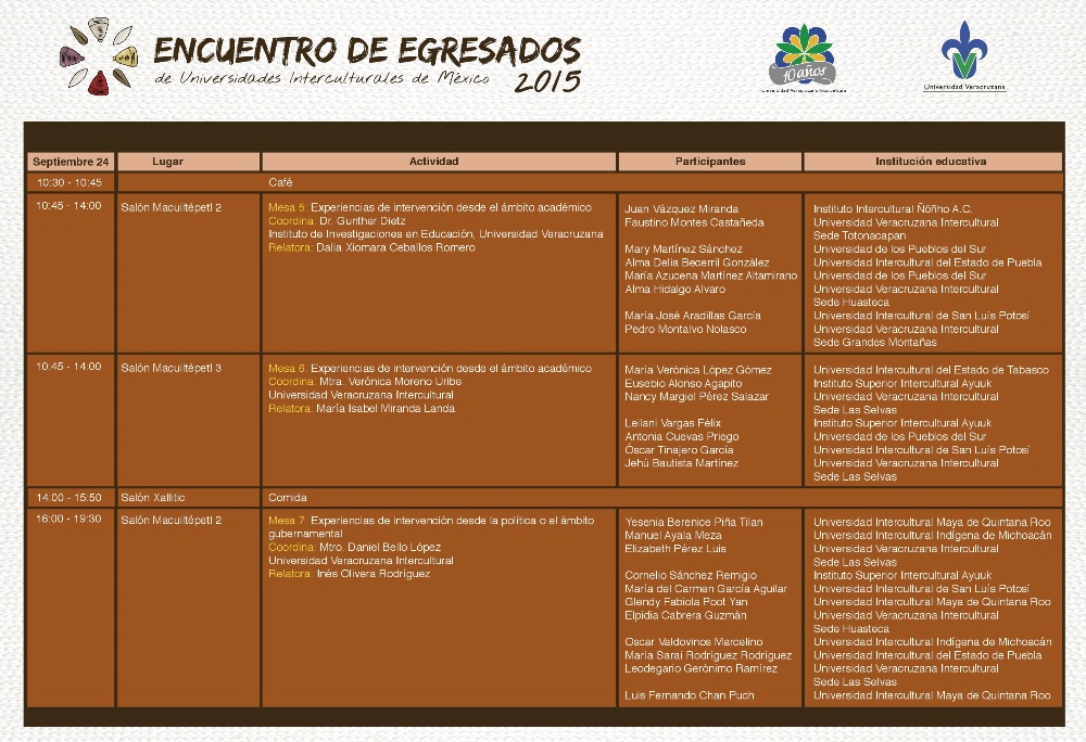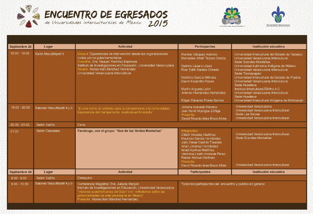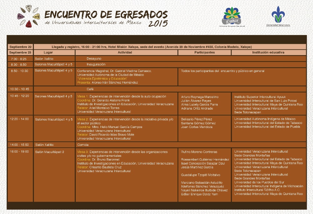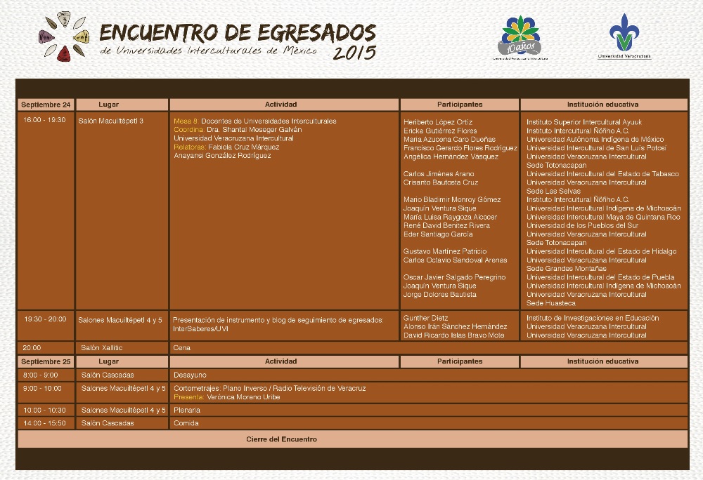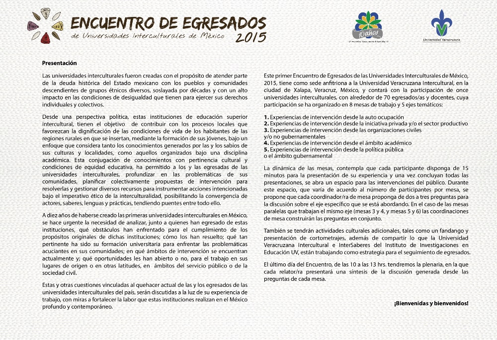 Este primer Encuentro de Egresados de Universidades Interculturales de México, 2015, tiene como sede anftriona a la Universidad Veracruzana Intercultural, en la ciudad de Xalapa, Veracruz, México, y contará con la participación de once universidades interculturales, con alrededor de 70 egresados/as y docentes, cuya participación se ha organizado en 8 mesas de trabajo y 5 ejes temáticos: