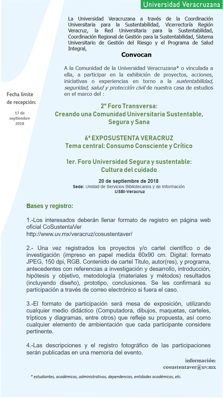 6a edición ExpoSustenta Veracruz 2018 ExpoSustenta Veracruz 2018. Tema Central: Consumo consciente y critico. Convocatoria y registro. Registro de proyectos Convocatoria