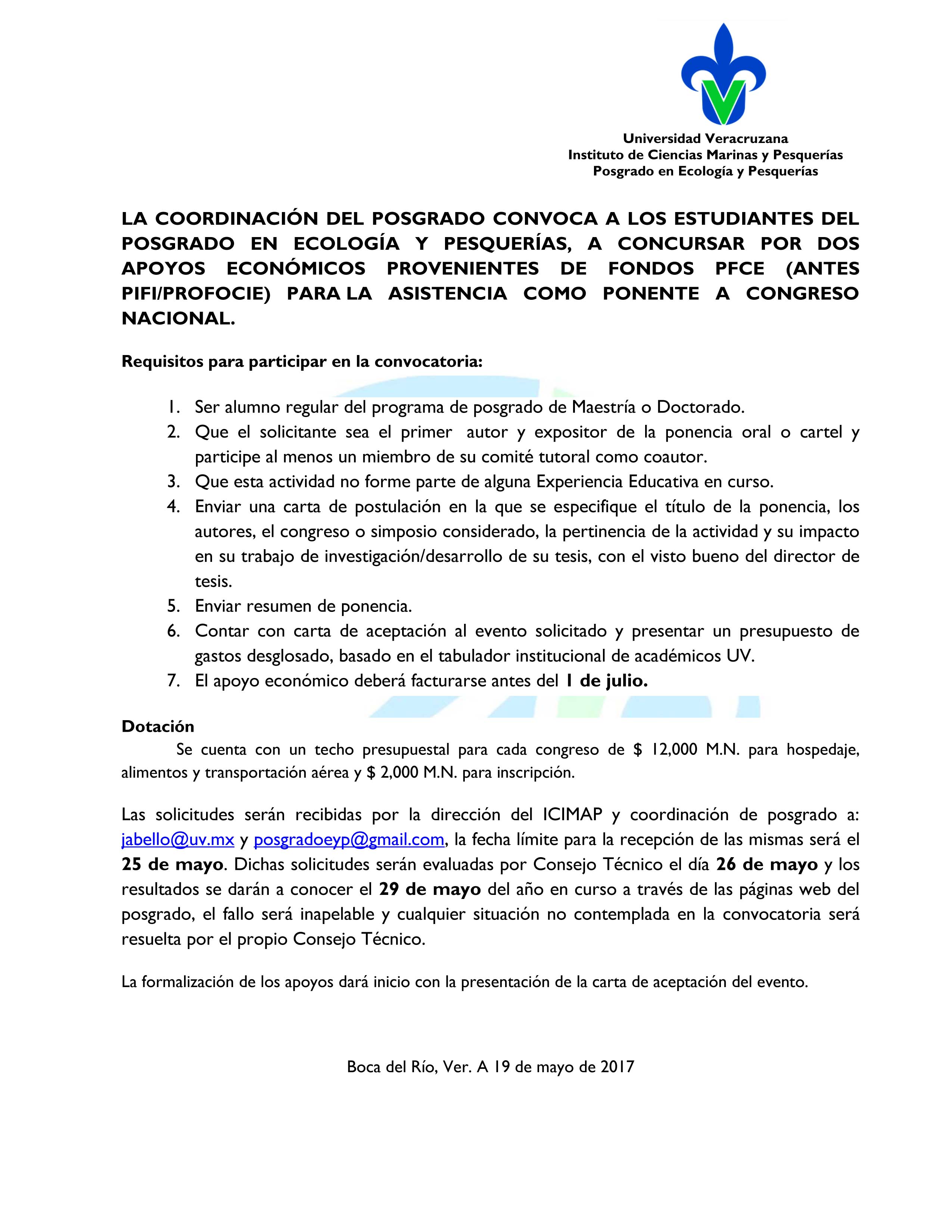 LA COORDINACIÓN DEL POSGRADO CONVOCA A LOS ESTUDIANTES DEL POSGRADO EN ECOLOGÍA Y PESQUERÍAS, A CONCURSAR POR DOS APOYOS ECONÓMICOS PROVENIENTES DE FONDOS PFCE (ANTES PIFI/PROFOCIE) PARA LA ASISTENCIA COMO PONENTE A CONGRESO NACIONAL.