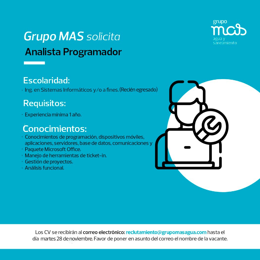 Grupo MAS Grupo MAS solicita Analista Programador Para más informes dirigirse al departamento de Vinculación: Dra. Estela Fernández