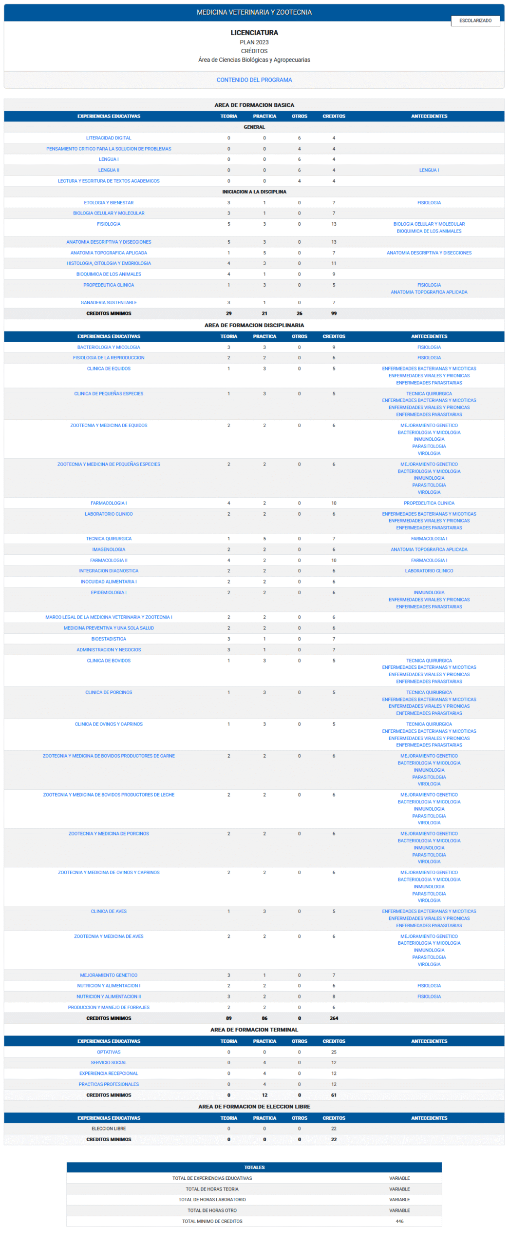 Licenciatura en Medicina Veterinaria y Zootecnia (Plan 2023) Mapa curricular del programa educativo (PE) de la Licenciatura en Medicina Veterinaria y Zootecnia (plan 2023, Escolarizado)