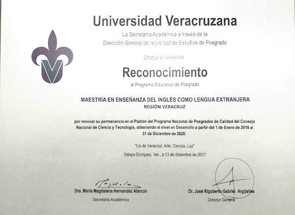 El posgrado de Maestría en enseñanza del Inglés como Lengua Extranjera se encuentra en el padrón del Programa Nacional de Posgrados de Calidad (PNPC) de CONACYT.