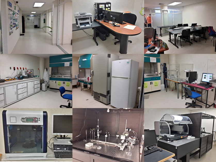 Contamos con áreas de fabricación de biochips, de síntesis, de manejo y almacenamiento de muestras biológicas a bajas temperaturas y de procesamiento de datos, los cuales están equipados con hornos para sinterizado y recocido, campanas de extracción de humos y de flujo laminar, sistema de electrohilado, mesa óptica, robot de impresión de microarreglos, microscopio de resonancia de plasmones superficiales, viscosímetro, pHmetros, parrillas, balanzas semi-analíticas, vortex, baño de ultrasonido, microcentrífuga, ultracentrífuga de temperatura controlada, ultracongeladores (-70 y -25 oC), refrigeradores, vidriería y material desechable, 5 computadoras para adquisición y procesamiento de datos y un servidor de 8 núcleos para desarrollo de modelos.