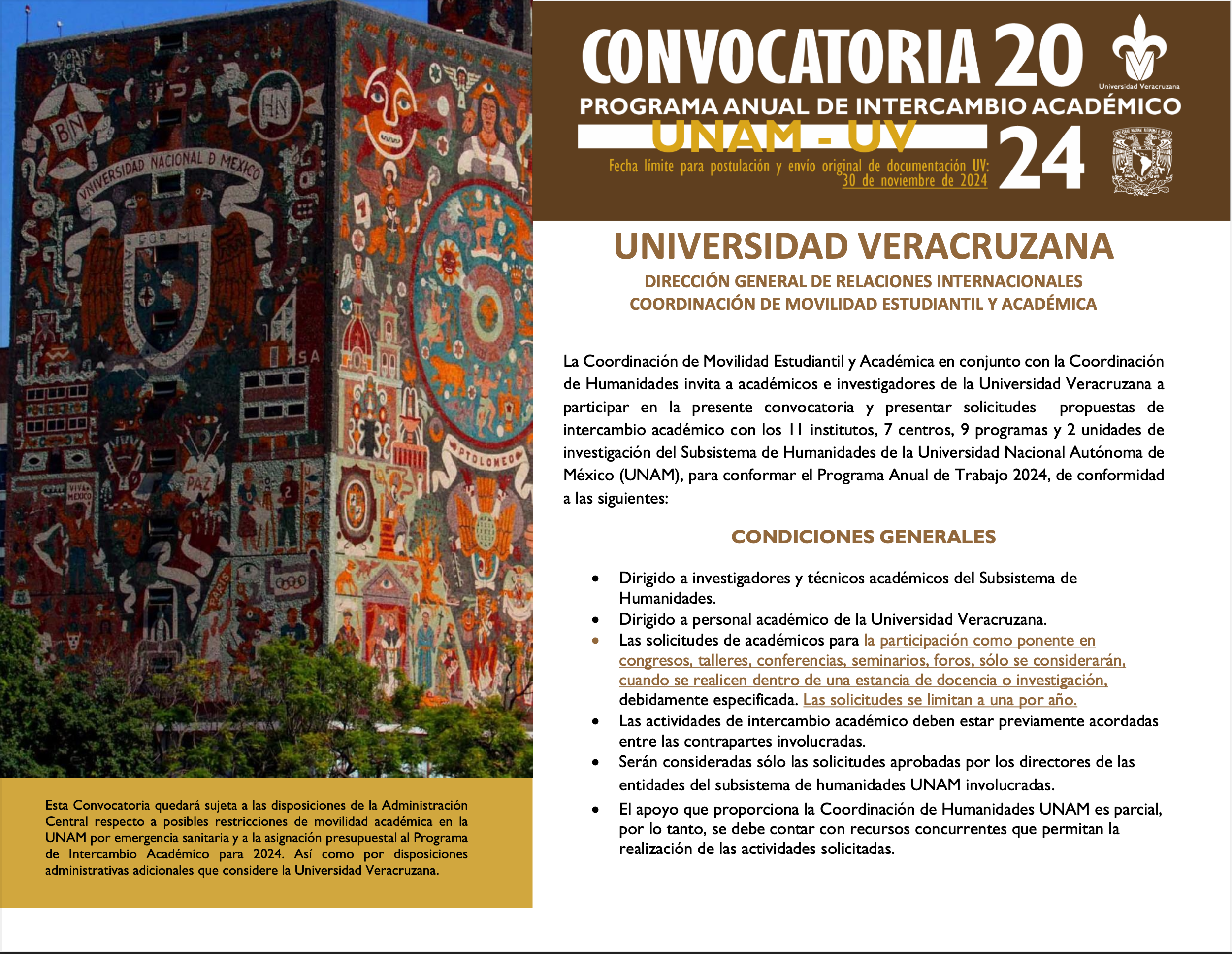 La Coordinación de Movilidad Estudiantil y Académica en conjunto con la Coordinación de Humanidades invita a académicos e investigadores de la Universidad Veracruzana a participar en la presente convocatoria y presentar solicitudes propuestas de intercambio académico con los 11 institutos, 7 centros, 9 programas y 2 unidades de investigación del Subsistema de Humanidades de la Universidad Nacional Autónoma de México (UNAM), para conformar el Programa Anual de Trabajo 2024