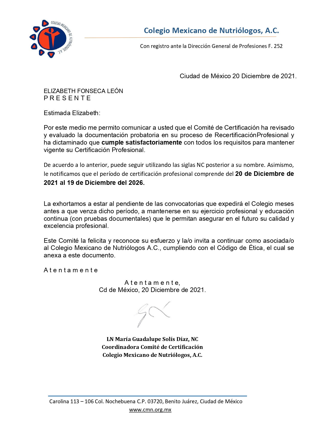 La Facultad de Nutrición felicita a la Mtra. Elizabeth Fonseca León por haber obtenido la Recertificación del Colegio Mexicano de Nutriólogos del 20 de Diciembre de 2021 al 19 de Diciembre del 2026.
