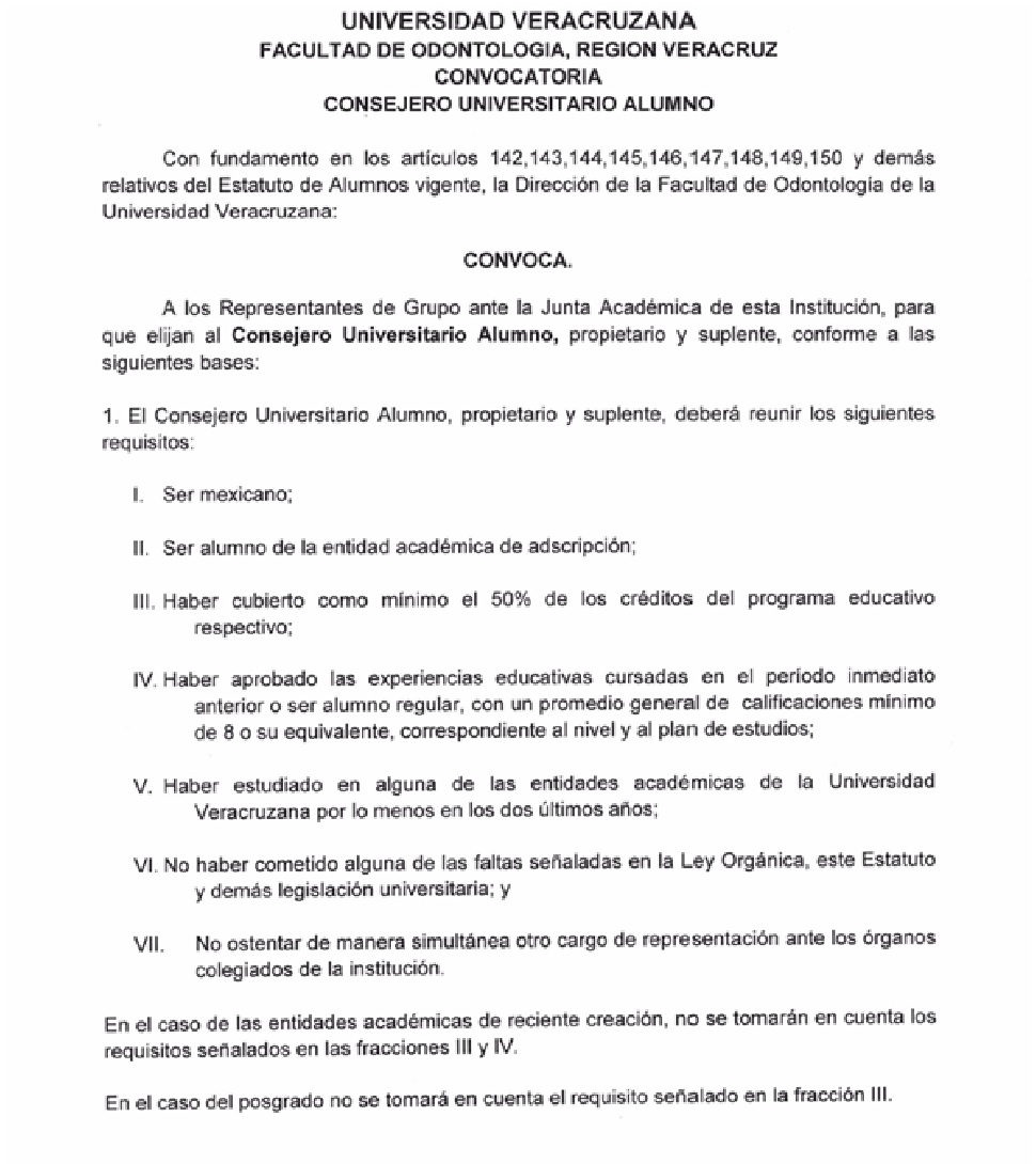 Convocatoria Consejero Universitario Alumno 2018-2019 La Facultad de Odontología, entidad académica de la Universidad Veracruzana, emite la siguiente convocatoria: convocatoria consejero alumno