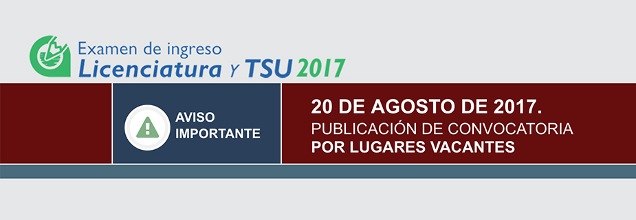 El 20 de agosto de 2017 será publicada la convocatoria por lugares vacantes en el portal: https://www.uv.mx/escolar/licenciatura2017