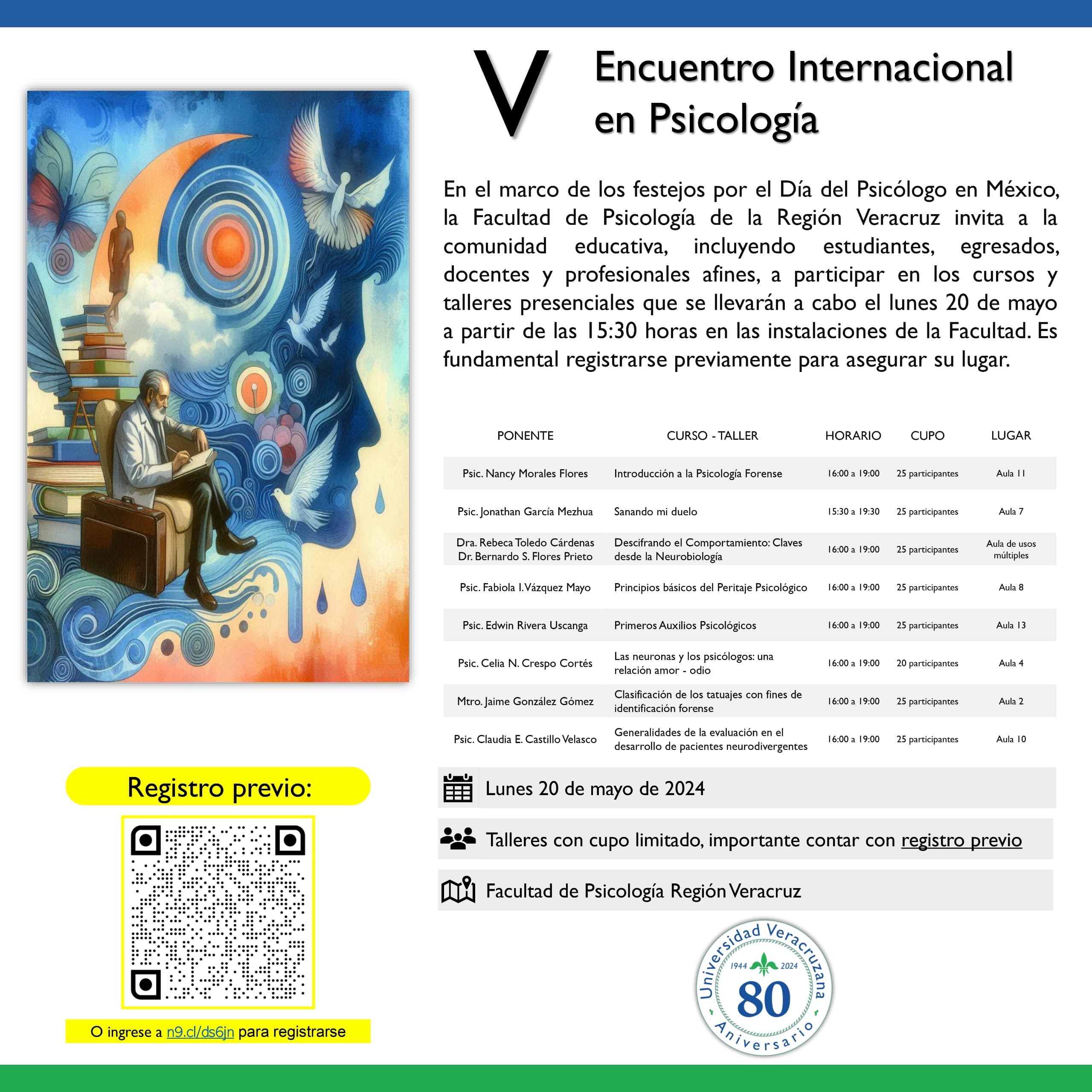 V Encuentro Internacional de Psicología 2024 Visita la pagina del evento y registra tu participacion, clic en imagen. Registro a los Cursos-Talleres de la Facultad de Psicología Región Veracruz, escanea el QR o clic en la imagen.