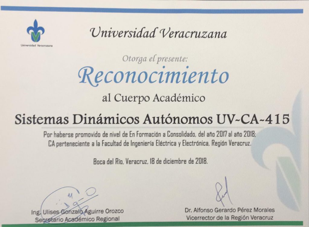 El cuerpo académico Sistemas Dinámicos Autónomos UV-CA-415 recibió reconocimiento por parte de las autoridades de la Universidad Veracruzana, al haber sido promovido del nivel «En Formación» al grado de «CONSOLIDADO»