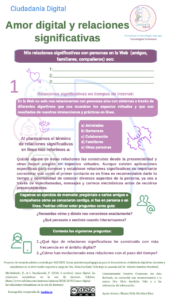 Identificador de la píldora Nombre de la píldora: Amor digital y relaciones significativas Dimensión de la ciudadanía digital: Estar y convivir en línea/Resiliencia en línea. Ámbitos: Relaciones digitales/Emociones y corporalidad digitales. Capacidades digitales:RD1. Mantener relaciones muy significativas con otras personas en línea. ECD1. Mantener conversaciones, enviar reacciones o compartir información espacios virtuales en los que participo de manera empática y respetuosa hacia mí y hacia los demás. Público al que va dirigido: Estudiantes y docentes. Tipo de recurso: Infografía Tiempo estimado: 3- 5 minutos Esta píldora puede ser utilizada sin fines de lucro, citando la fuente, respetando los términos de la licencia Creative Commons, con atribución no comercial y sin derivadas. El diseño psicotecnopedagógico del guion que sirvió de base puede descargarse. |