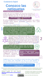Identificador de la píldora Nombre de la píldora: Conozco las netiquetas Dimensión de la ciudadanía digital: Estar y convivir en línea/Resiliencia en línea Ámbitos: Comunicación digital/Emociones y corporalidad digitales. Capacidades digitales: COMD1. Comunicarme efectivamente con otras personas y con sistemas de inteligencia artificial a través de medios digitales. COMD2. Aplicar reglas básicas de comunicación en línea, mejor conocidas como netiquetas. ECD1. Mantener conversaciones, enviar reacciones o compartir información espacios virtuales en los que participo de manera empática y respetuosa hacia mí y hacia los demás. Público al que va dirigido: Estudiantes y docentes. Tipo de recurso: Infografía Tiempo estimado: 3- 5 minutos Esta píldora puede ser utilizada sin fines de lucro, citando la fuente, respetando los términos de la licencia Creative Commons, con atribución no comercial y sin derivadas. El diseño psicotecnopedagógico del guion que sirvió de base puede descargarse. |