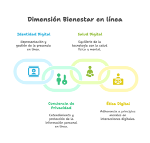 Esta dimensión fortalece el compromiso y responsabilidad del autocuidado y cuidado a partir del reconocimiento de su identidad y presencia digital, la consciencia de su privacidad y seguridad, la salud e higiene digitales en un marco de ética y valores digitales.Esta dimensión, considera los siguientes ámbitos: