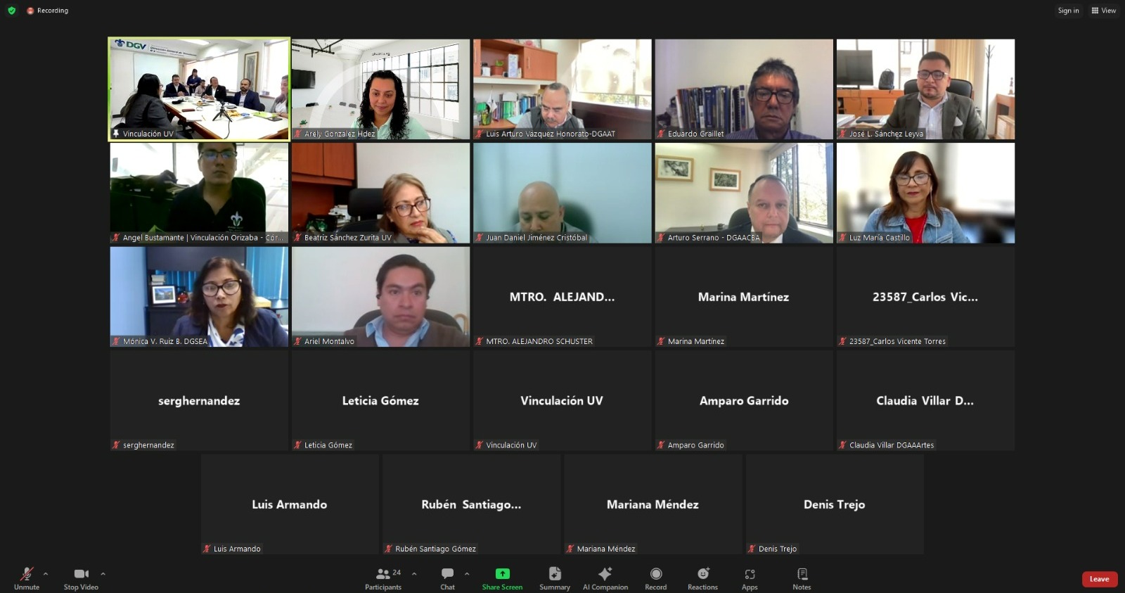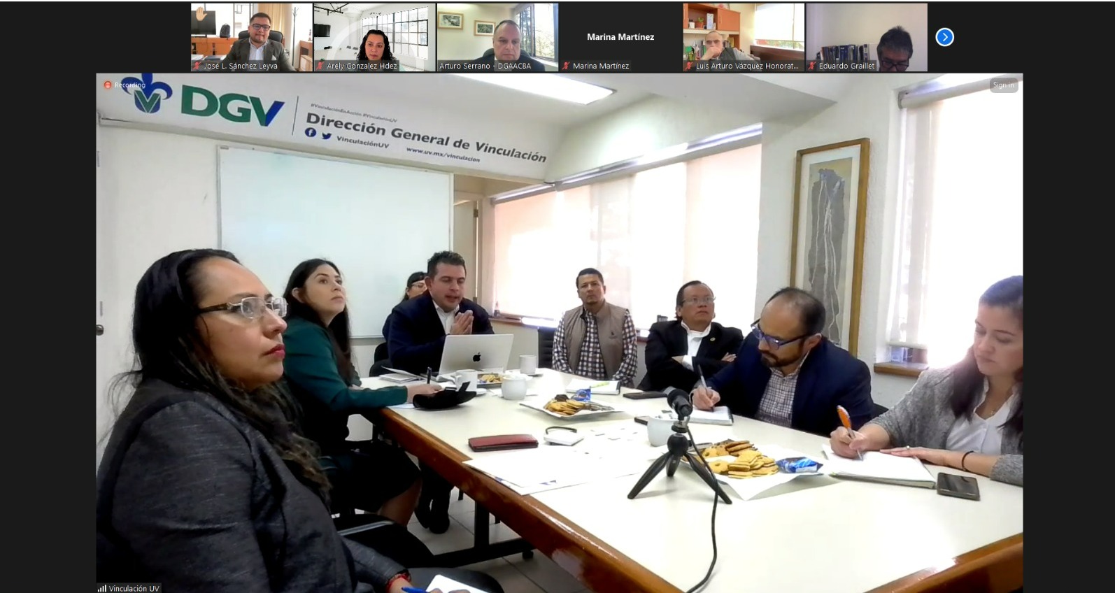 La reunión fue presidida por el Dr. Serafín Flores de la Cruz, Director General de Vinculación, organizada a través del Departamento de Vinculación con el Sector Productivo. Estuvieron presentes por parte de la UV: Mtra. Karen Lisset Guerrero Ramírez, en representación del Dr. Juan Ortiz Escamilla, Secretario Académico, la Lic. Claudia Hernández Hernández, Coordinadora del Programa de Egresados, Mtro. José Luis Sánchez Leyva, Director General del Área Económico Administrativa, Dr. Luis Arturo Vázquez Honorato, Director General del Área Técnica, Dr. Arturo Serrano Solís, Director General del Área Ciencias Biológico Agropecuarias, Dra. Beatriz Sánchez Zurita, Directora del Área Académica de Artes, Dr. Arturo Aguilar Ye, Director General del Área de Ciencias de la Salud, Mtra. Mónica Ruiz Balcazar, Directora del Sistema de Enseñanza Abierta, Mtro. Ariel Montalvo Torres, en representación del Dr. Daniel Bello López, Director General de la UVI. Así mismo estuvieron presentes los Jefes de Departamento de la Dirección General de Vinculación, Coordinadores Regionales de Vinculación y algunos Coordinadores de Vinculación y Egresados de entidad.
