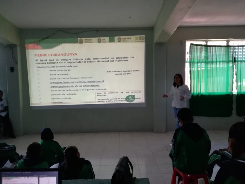 María Guadalupe, Arturo, Perla de Guadalupe y Jesús Ángel conscientes de lo importante que es dar a conocer las medidas de prevención para evitar más casos, durante la plática abordaron varios aspectos sobre el mosquito transmisor, su ciclo de vida, el proceso de infección, los lugares más frecuentes de incubación, los síntomas o cuadros clínicos y las acciones de prevención. No sólo hablaron del Dengue, incluyeron también Zika y Chicungunya. Es así como los alumnos de este plantel saben qué medidas preventivas deben realizar en sus casas y cómo identificar un contagio.